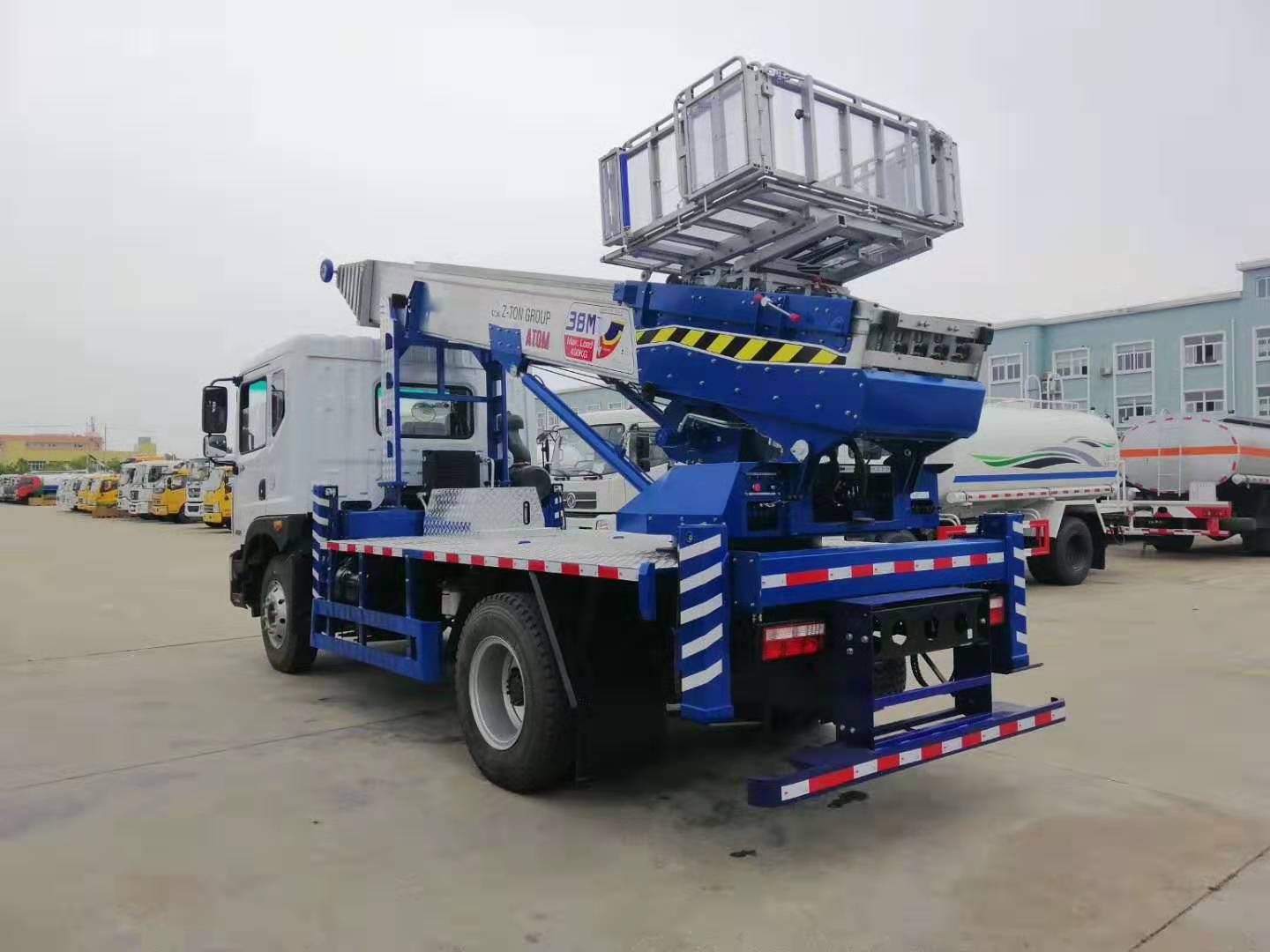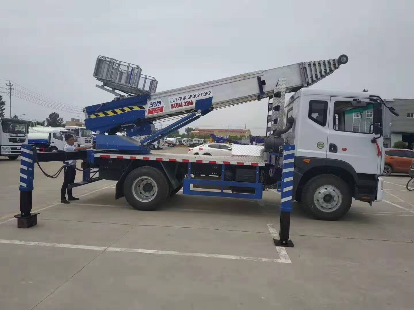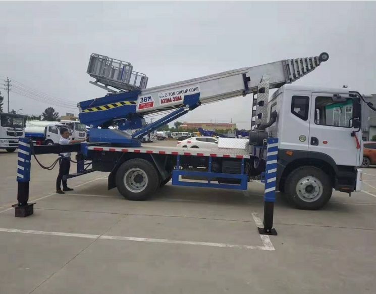 我公司生產的38米高空作業云梯車質量穩定、經驗豐富、技術過關。云梯采用韓國原廠整裝進口,通過不斷完善云梯車的性能,制造出一流的高空作業云梯車,進口液壓支腿,進口鋁合金貨斗,進口液壓散熱器,100米無線遙控(德國系統),遙控功能:1控制料斗上下、2:云梯角度遙控、3:云梯旋轉遙控、4:云梯伸縮遙控、可以加速、減速,梯臂為韓國最新技術梯臂,梯臂采用特種鋁合金,是分離模式,末端帶有滑輪。云梯搬家車的云梯單次載重400公斤,作業高度有28米、32米、38米、45米,可以用于工程租賃,幕墻施工,樓頂太陽能、樓頂防水作業,廣告高炮,電力維修,空調室外機安裝,船舶維護,搬家公司,水泥沙子搬運,路橋修護等多種功能。藍色牌照,C證駕駛,無需特種操作證。非營運車輛,使用期限長。