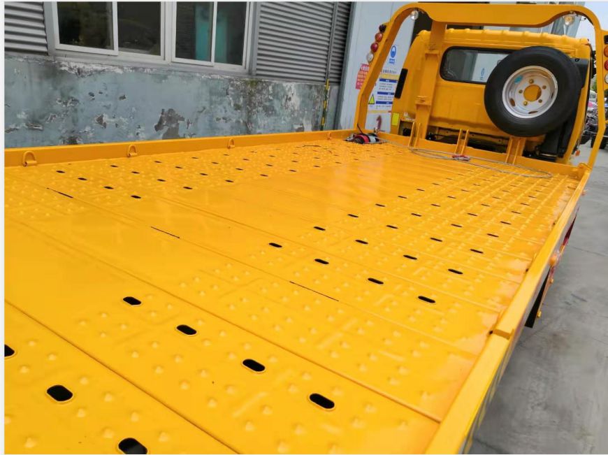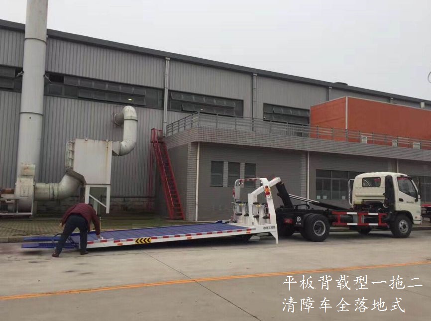 7.平板背載型一拖二清障車還可設計制造在駕駛室與平板之間加裝起重吊機或液壓升降平臺,增加車輛多功能性。也可以設計制造通過液壓機構使平板全落地,方便超低底盤車輛拖運。還可根據(jù)特殊用戶要求制作伸縮平板,特種情形下平板可以向后延長70CM,以應對超長車輛的清障運輸工作。